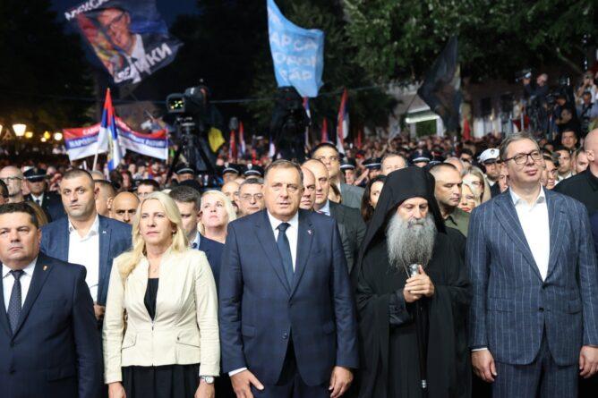 – Ne možemo vaša svetosti da živimo sa onima koji uporno žele da nas smanje i eliminišu i da nas iz Srpske protjeraju. Moramo se okupiti Srpska želi da vidi veliki i snažnu junačku Srbiju – zaključio je Dodik i dodao – Mi moramo da preživimo, zato nema povlačenja. Uvijek kada smo oprostili zločin nad nama, to je bio početak novog zločina nad nama. Moramo da kažemo šta hoćemo, nosite se i vi i vaša vladavina prava, kakva vladavina prava? Pustite nas na miru, moramo da stanemo i da se narod konsoliduje, oko politika, BiH nije moja država, moja država je Srbija i Republika Srpska, i ne vrijeđam nikoga. Zašto vam to smeta što kažem? Navijam za Srbiju, ne navijam za BiH, hoćete da nas istjerate, niste nam ništa dali! – rekao je Dodik.