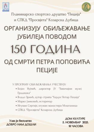 Planinarsko sportsko društvo „Pecija“ i Srpsko prosvjetno i kulturno društvo „Prosvjeta“ Kozarska Dubica organizuju obilježavanje 150 godina od smrti Petra Popovića Pecije.