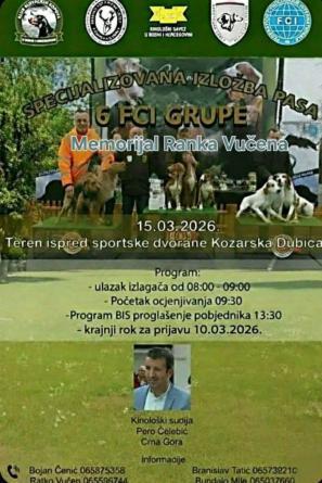 U nedjelju, 15. marta u Kozarskoj Dubici biće održana  Specijalizovana izložba pasa VI FCI grupe  “Memorijal Ranka Vučena”. Rok za