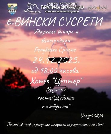 Turistička organizacija Kozarska Dubica će, u saradnji sa Udruženjem vinara i vinogradara Republike Srpske, okupiti ljubitelje vina u prijatnom ambijentu hotela “Zepter” ,a izlagačima vina pridružiće se i dva proizvođača sira i jedan proizvođač rakije.